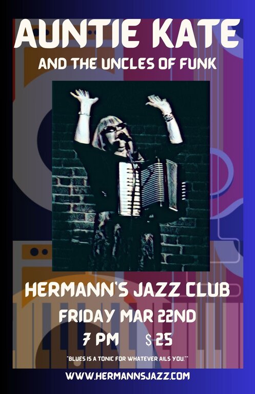 Auntie Kate hits the stage like a barely controlled force of nature, rocking and kicking out a powerful blues routine. She is a charismatic singer with a style all her own.