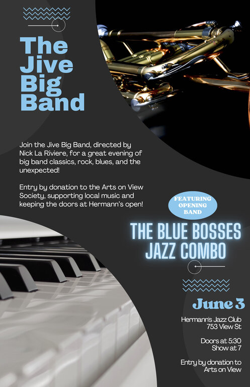 Join Nick La Riviere’s Jive big band (Jive stands for Jazz In Victoria Ensemble) as they entertain you with a mix of classic swing, unexpected fun, and a great night of music all around. They’re joined by The Blue Bosses, directed by Ashley Wey, performing an exciting variety of jazz jams! Entry is by donation to Arts On View, keeping the doors at Hermann’s Jazz Club open and supporting the local music scene!