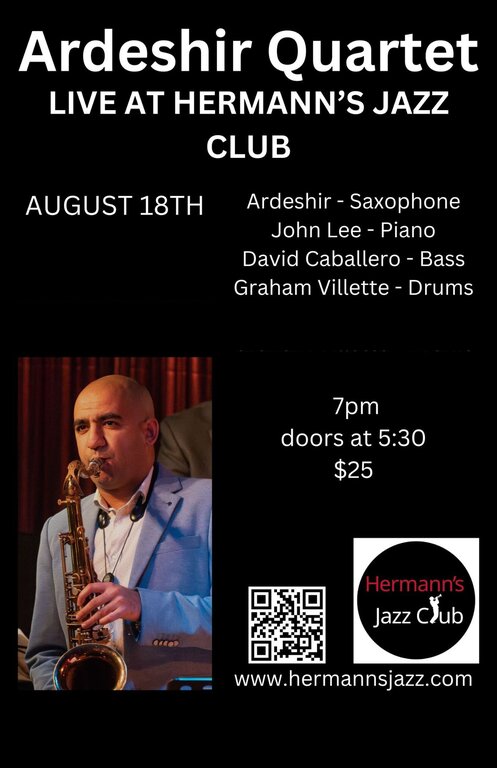 "Saxophonist Ardeshir Pourkeramati is one of Vancouver’s most active young musicians. Having relocated to Los Angeles the past year, he is pursuing a doctorate in jazz at the University of Southern California. His quartet is rooted in the jazz tradition and draws inspiration from a variety of musical influences. Joining him are his great friends and collaborators, pianist John Lee, bassist David Caballero, and drummer Graham Villette."