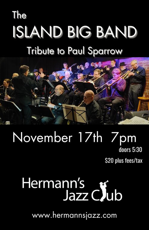 Sun. November 17th 2024 7:00 PM - 9:00 PM doors at 5:30 PM (All Ages) In late August 2024 we lost Paul Sparrow a founding member of The Island Big Band. Join the band in musical tribute to Paul's love of the trumpet and the big band repertoire.