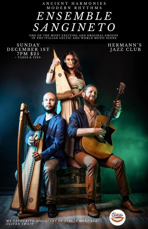 Ensemble Sangineto is an eclectic band which skillfully blends ancient harmonies and sonorities with modern rhythms. Founded by the Sangineto twins, Caterina and Adriano, whose father is respected Italian luthier Michele Sangineto, they were brought up hearing famous artists such as Derek Bell of the Chieftains, and Breton harpist and singer Alan Stivell. With guitarist Jacopo,the experiences of the individual members converge,creating