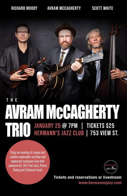 Enjoy an evening of unique and creative exploration as three well seasoned musicians fuse their passions for ‘20s Trad Jazz, Roma Swing and Classical music Richard Moody- violin, Scott White- bass and Avram McCagherty- guitar and vocals