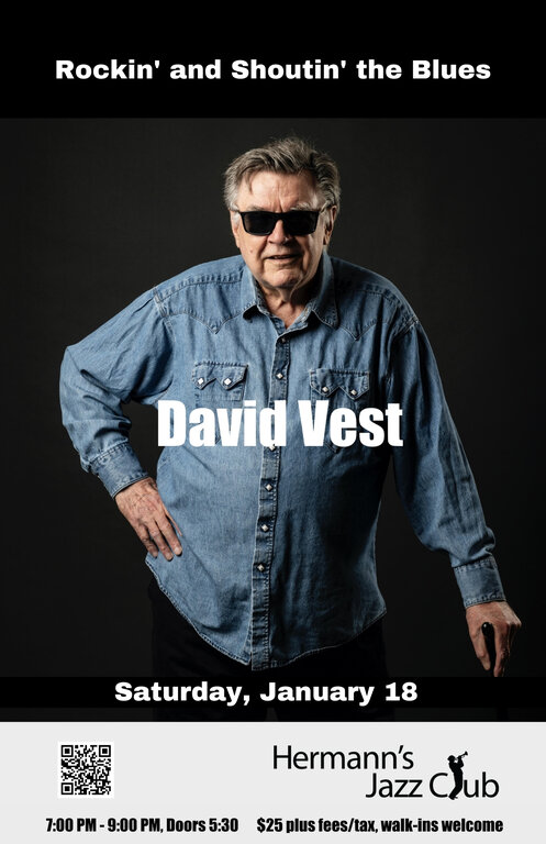 Sat. January 18th 2025 7:00 PM - 9:00 PM doors at 5:30 PM (All Ages) Multiple Maple Blues Award winner David Vest and his red hot band will be Rockin' and Shouting' the Blues in their first show of 2025, turning Hermann's into a good-times Gulf Coast juke joint, playing blues classics with a healthy helping of David's original tunes.