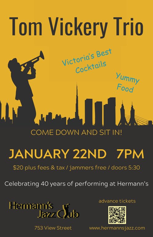 Celebrating 40 years of performing at Hermann’s. Come join the party with Tom and friends for a relaxed evening of jazz, cocktails and great food! Musicians are welcome to come and sit in with the band.