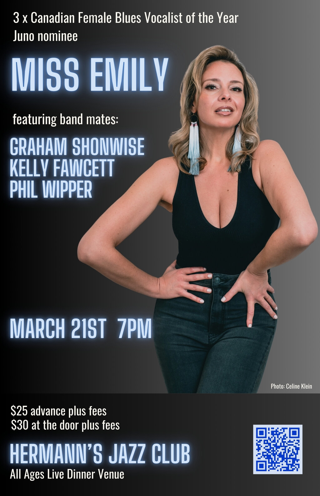 JUNO Nominee and three time Canadian Blues Female Vocalist Of the Year winner Miss Emily brings her unique soul-blues to the West Coast!