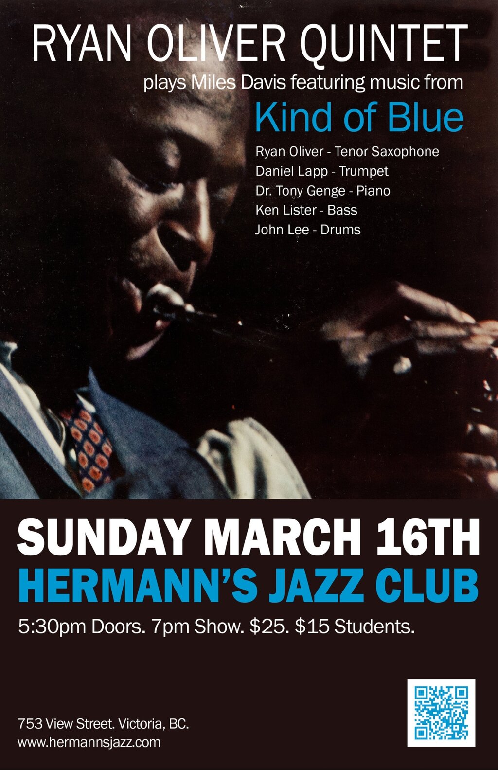 Join Juno-nominate saxophonist and West Coast Music Awards Jazz Musician of the Year nominee Ryan Oliver and an all star ensemble as they perform the music of jazz icon Miles Davis. This concert will feature music from Miles Davis' 1950s-60s groups including tunes from his iconic album, "Kind of Blue", one of the best selling jazz albums of all time.