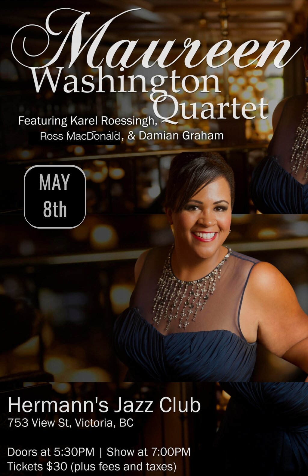 Join us for an unforgettable evening at Hermann's Jazz Club featuring the incredible talents of Maureen Washington and her trio of accomplished musicians: Karel Roessingh on piano, Joey Smith on bass, and Damian Graham on drums. Maureen, renowned for her powerful and soulful voice, will deliver a captivating performance blending jazz, blues, and soul. Don't miss this chance to experience live jazz at its finest in the heart of Victoria!