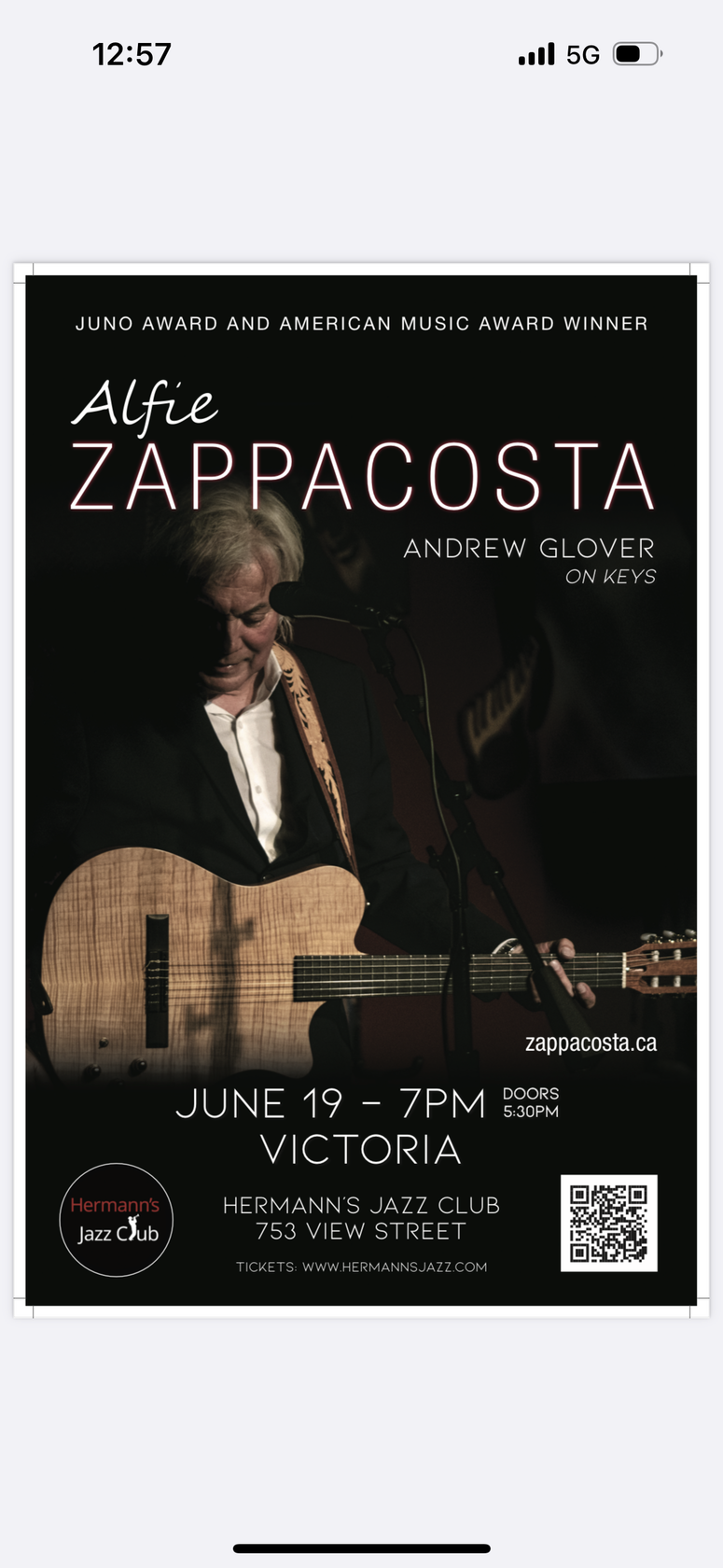 Thu. June 19th 2025 7:00 PM - 9:00 PM doors at 5:30 PM (No Minors) Two time Juno award winner singer songwriter Alfie Zappacosta delivers a performance like no other. A sophisticated musician with international poise Alfie sings in both English and Italian; studied in jazz and classical guitar. He is a virtuoso composer and seasoned live performer. Alfie's rich soaring vocals have always been his signature and his songs diverse drawing from pop, jazz and rock elements.