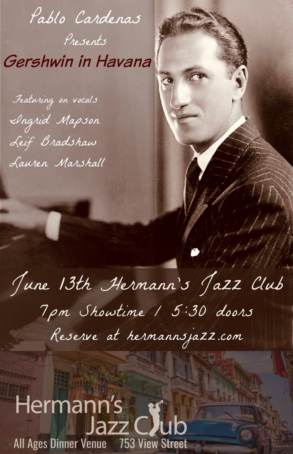 World class Cuban pianist Pablo Cardenas is back to Hermann’s Jazz Club to perform the best of Gershwin in Cuban style, recreating his music with modern harmonies and Afro Cuban rhythms, a perfect fusion you don’t want to miss. Pablo will be inviting two outstanding guest vocalists, Leif Bradshaw and Ingrid Mapson and Lauren Marshall, with an all star line up of musicians.