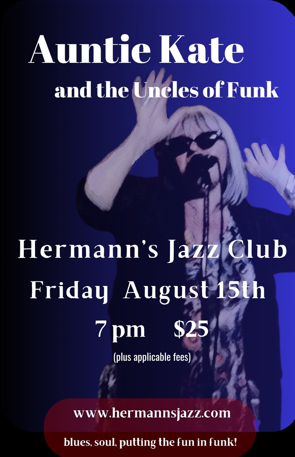 Auntie Kate hits the stage like a barely controlled force of nature, rocking and kicking out a powerful blues routine honed in the clubs of Western Canada. Originally from Saltspring Island, but calling Victoria, or anywhere she is performing, home, she is a charismatic singer with a style all her own.