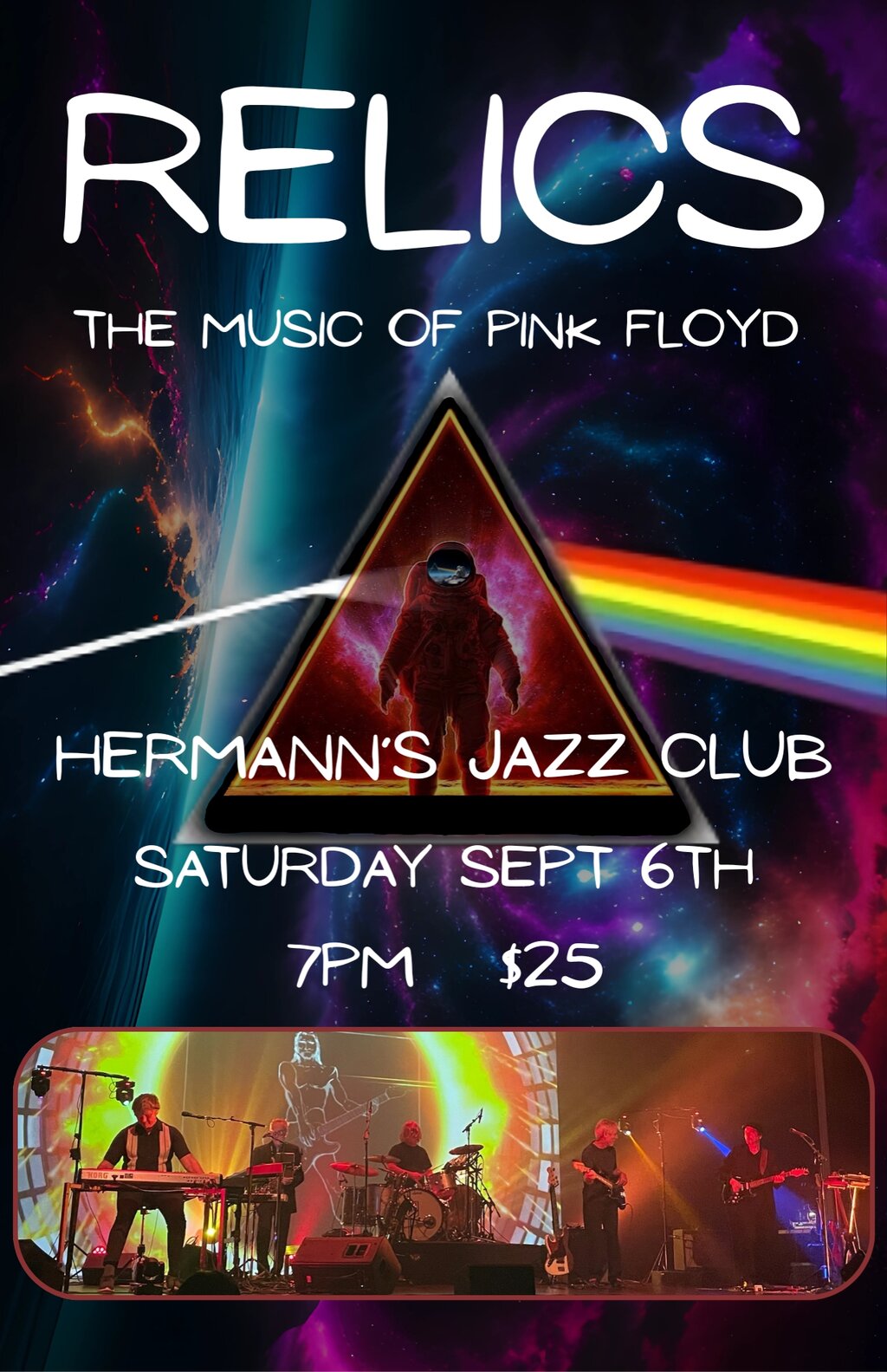 RELICS: an early Pink Floyd experience pay homage to the early days of Pink Floyd, focusing primarily on the 1967-1975 period of the band's illustrious career. Songs like "Astronomy Domine", "Lucifer Sam", "Fearless", "Wish You Were Here" and "Echoes" from albums such as A Saucerful of Secrets, Umma Gumma, The Piper at the Gates of Dawn, and Meddle.