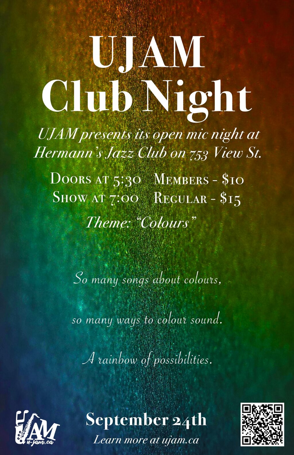 Jazz loves colour! Black Coffee, Mood Indigo, Red Sails in the Sunset, Deep Purple, On Green Dolphin Street, Over the Rainbow, and enough “Blue” songs alone to fill a set list. Come and find out how our singers and instrumentalists play with this month’s UJAM theme of "Colours". Or better still, join us on stage! See QR code to register.