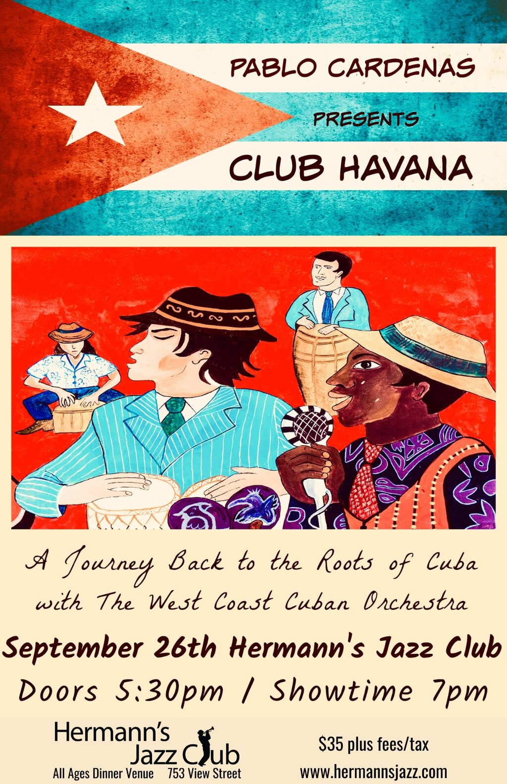 Club Havana is dedicated to the history of popular Cuban music, the island of Celia Cruz, Irakere, Cachao, Arsenio Rodrigues, Miguel Matamoros, Celina Gonzales, Benny More and many other legendary musicians, where you will enjoy the endless universe of rhythms originated from the island of music and perceive that particular and engaging sound that made this music unique and internationally popular. Pablo Cardenas and The West Coast Cuban Orchestra will show you a great variety of rhythms and musical genres originating in Cuba from the roots to the most modern tendencies. Those sounds that represent Cuban music, also represent Latin music in a big portion, like the traditional son, cha cha, salsa, danzon, mambo, conga, rumba, bolero and many others.
