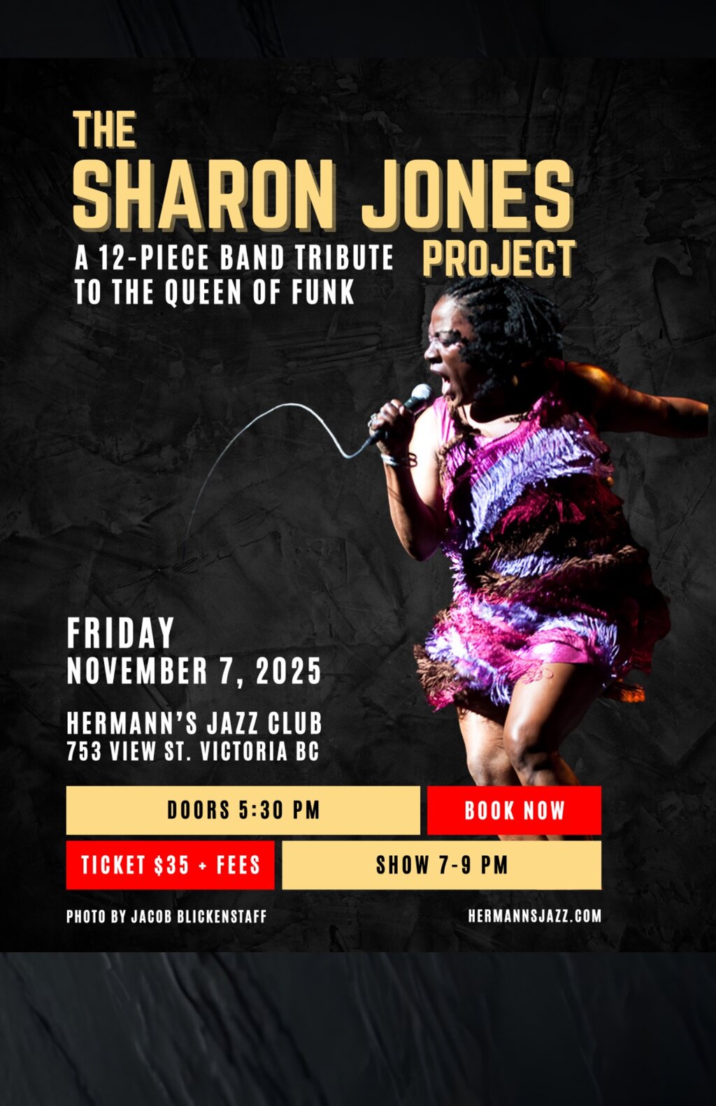 Fri. November 7th 2025 7:00 PM - 9:00 PM doors at 5:30 PM (All Ages) Local diva Katherine Beckett is living her dream, bringing the music of her idol, the inimitable Sharon Jones and her Dap-Kings, back to the stage. After a successful show last year at the Alix Goolden Performance Hall, featuring a 12-piece band of some of Victoria’s finest, they’re excited to bring this fiery funk and soul music to Western Canada’s oldest continuously running Jazz Club, in commemoration of Sharon’s death in November 2016. Band personnel: myself, Hilary Beckett, Michelle Ray, Pedro Arbour, Bridget Weston, Dave Anderson, Avian Marinakis, Jody Dick, Eric Hughes, Rhys Batstone, Hannah Kaehn, and Dave Flello.