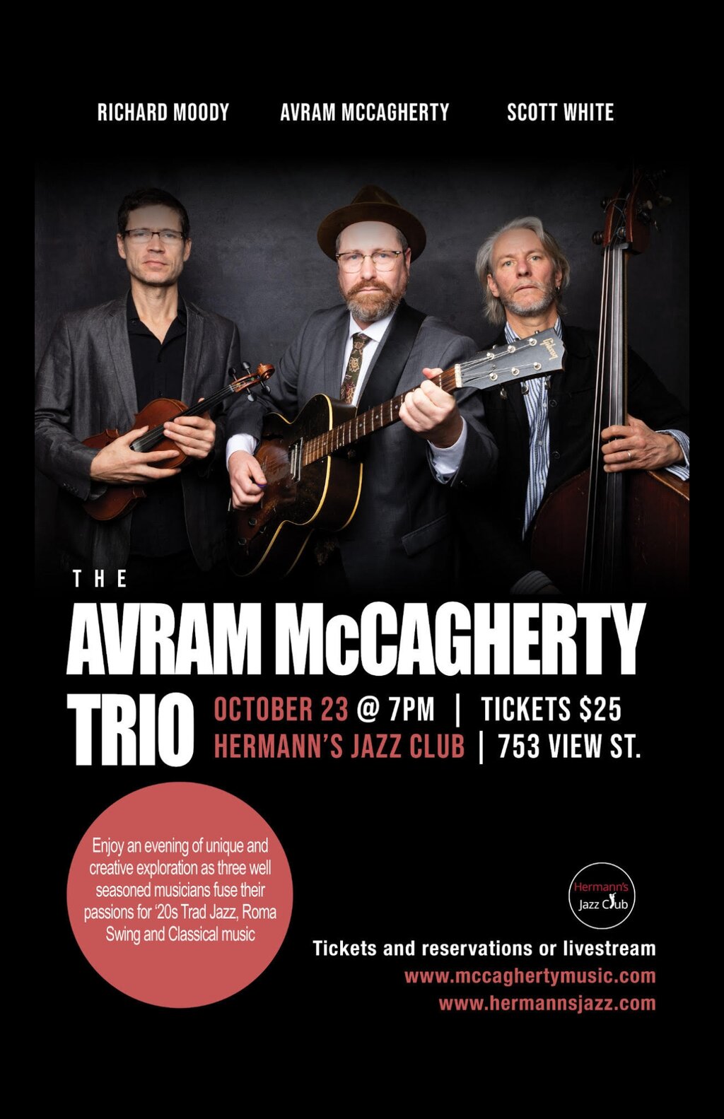 Enjoy an evening of unique and creative exploration as three well seasoned musicians fuse their passions for ‘20s Trad Jazz, Roma Swing and Classical music Richard Moody- violin, Scott White- bass and Avram McCagherty- guitar and vocals