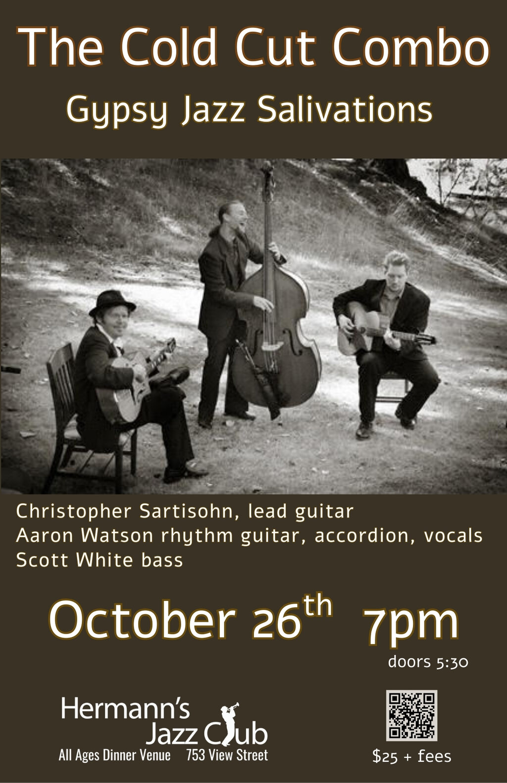 "The Cold Cut Combo is a Victoria-based gypsy jazz duo that has been enchanting audiences for over two decades with their virtuosic jazz Manouche guitars, soulful accordion, and sweet vocals. Formed in 2001, the duo consists of Christopher Sartisohn on lead guitar and Aaron Watson on rhythm guitar, accordion, and vocals. They will be joined by veteran Scott White on bass to make this an exciting trio.