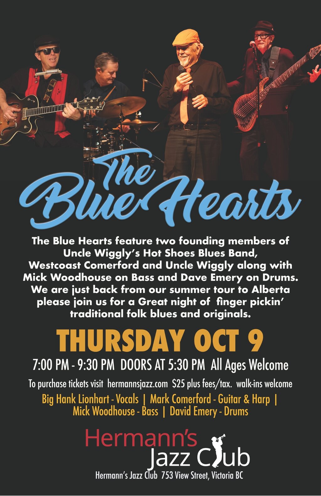 Dave Emery on Drums adds a whole lot to the sound of the Blue Hearts. We are excited to have you hear us with Dave on the Kit. He kicks it good…