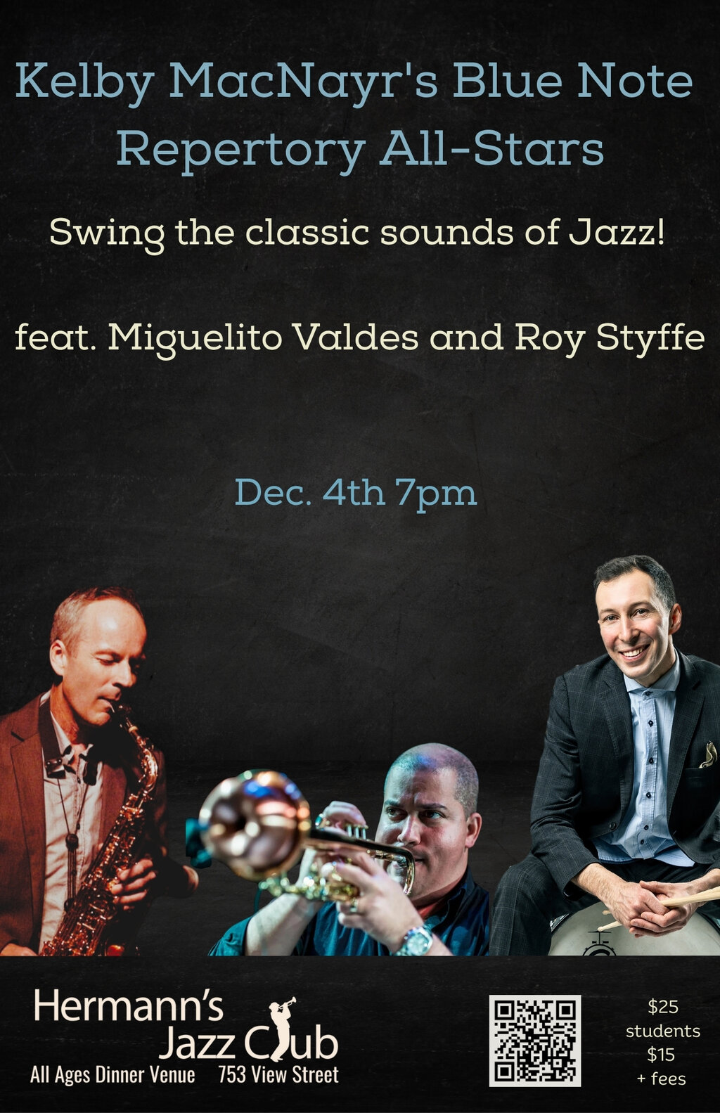 Kelby MacNayr's Blue Note Repertory All-Stars features Cuban trumpet sensation Miguelito Valdes, the lyrical saxophonist Roy Stffe, pianist Dr. Tony Genge and explosive drumming of Kelby MacNayr! and MORE!