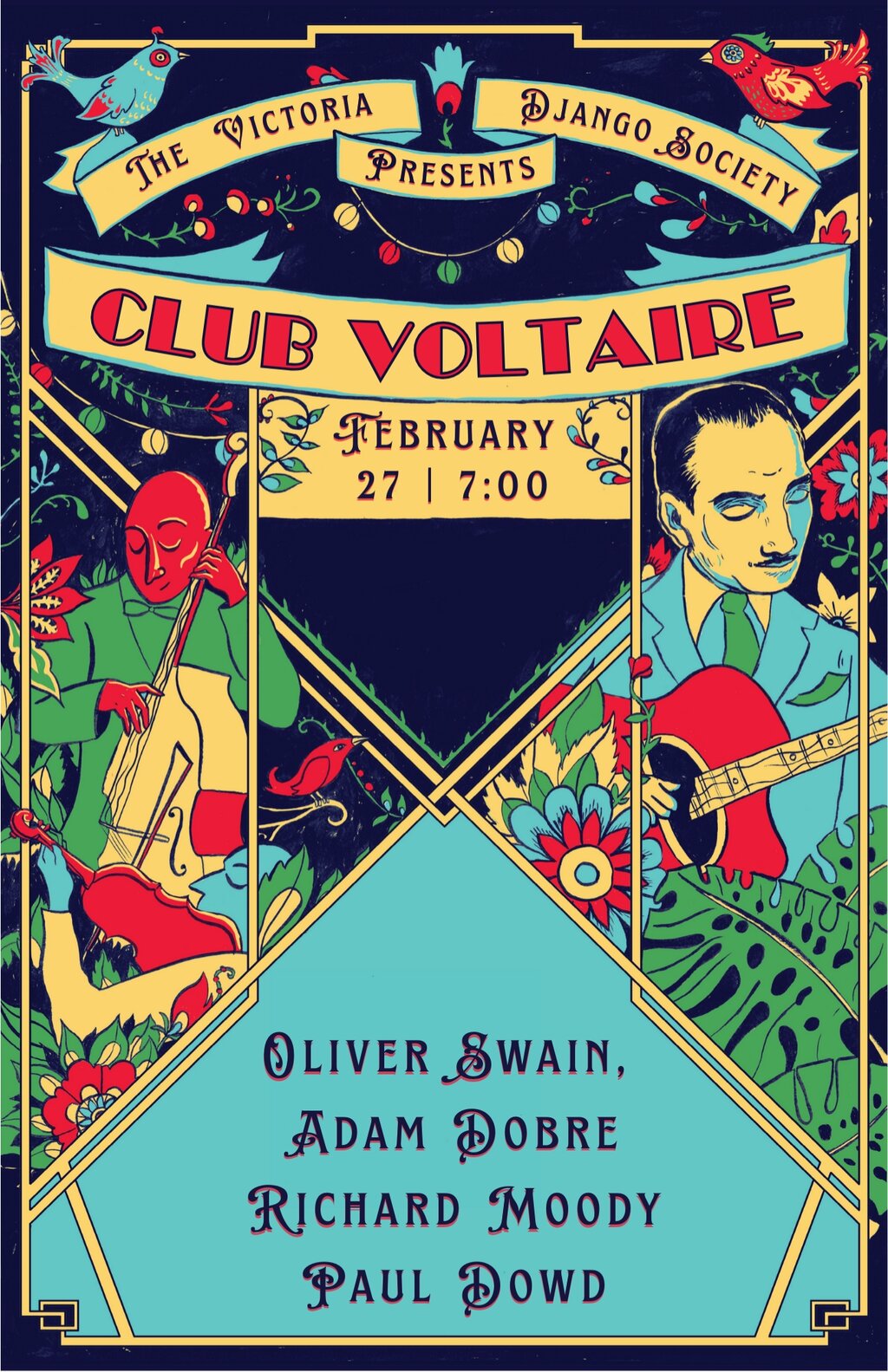Performing in the style of Django Reinhardt and Stephane Grappelli, popular in the hot clubs of France in the 1920s & and 1930s, Club Voltaire has a set filled with hot swing, sizzling Latin and sultry ballads. Stunning instrumentalism and soaring vocals by four of Victoria’s premiere acoustic jazz artists featuring Richard Moody (Deva Premal, The Wailin' Jennies), Adam Dobres (WCMA nominee), Oliver Swain (2 x WCMA award winner and Juno nominee) & Paul Dowd.