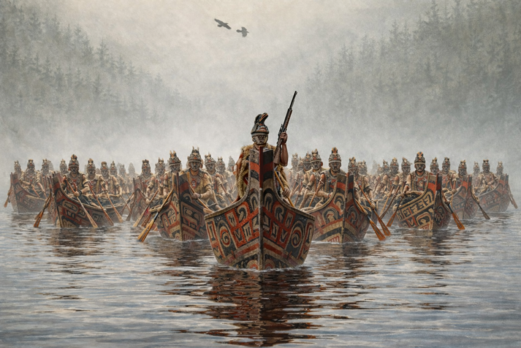 Image credit: Haida warriors, AI-generated image inspired by Bill Holm’s painting, Raven Warrior.