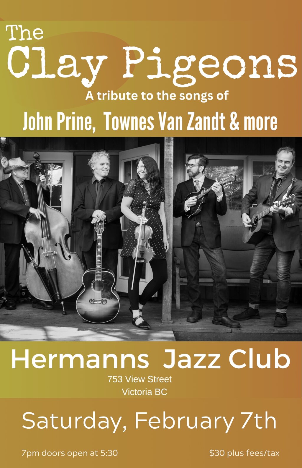 Based out of Victoria, BC, The Clay Pigeons bring a fresh approach to some of the greatest songs written by the greatest American songwriters....John Prine, Iris Dement, Townes Van Zandt, Blaze Foley, Willie Nelson and others. The Clay Pigeons was first conceived by Rachelle Reath, Aaron Watson and Kelly Fawcett, members of the popular Tom Waits tribute, The Beautiful Maladies and features Victoria bass master, Joey Smith and mandolin virtuoso Brad Shipley from Gabriola Island. Expect to hear beautiful songs, big vocal harmonies and stellar instrumental arrangements from 5 of the coasts most celebrated musicians.