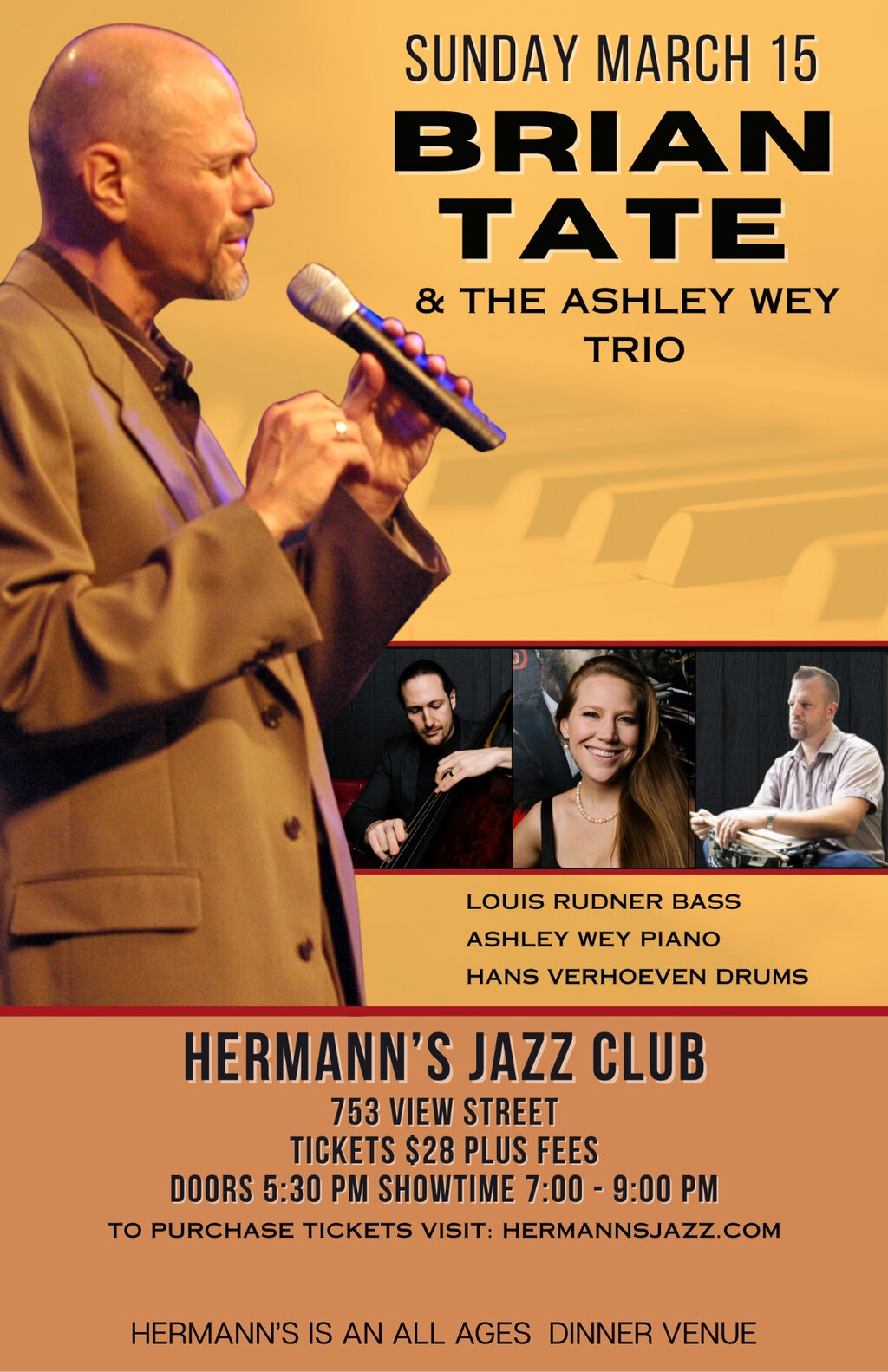 Brian will be appearing with the popular Ashley Wey Trio with Ashley Wey on piano, Louis Rudner on bass and Hans Verhoeven on drums.