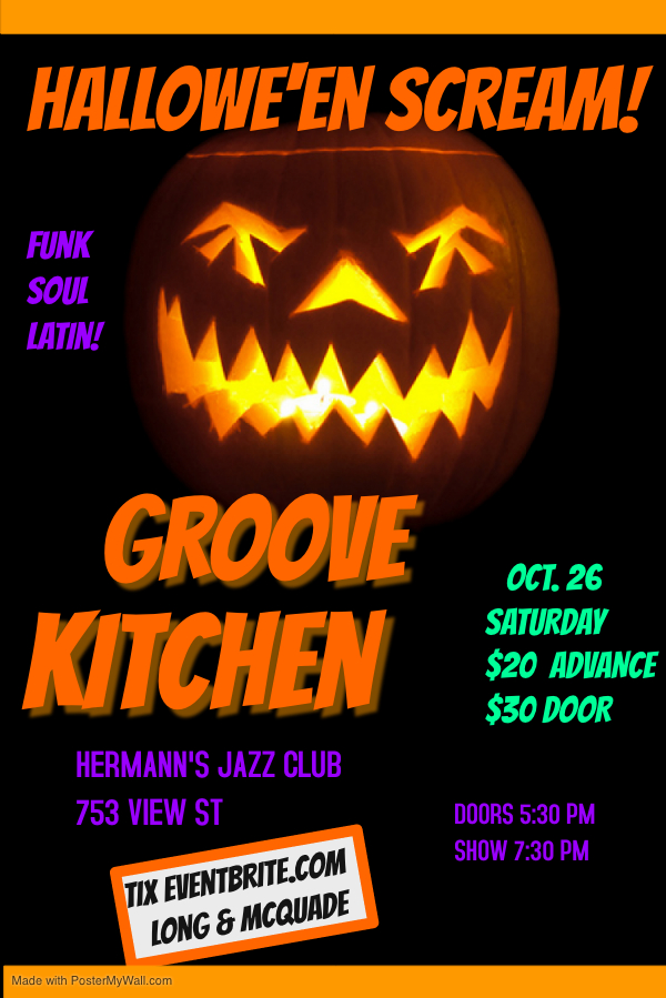 Sat. October 26th 2019 7 p.m. - 11 p.m. doors at 5 p.m. (All Ages) Popular soul-funk band Groove Kitchen stages its legendary annual Hallowe'en dance at Hermann's Jazz Club. Earth Wind & Fire, James Brown, Justin Timberlake and more! Costumes welcome. Tickets at groovekitchen.ca, eventbrite, Long & McQuade.
