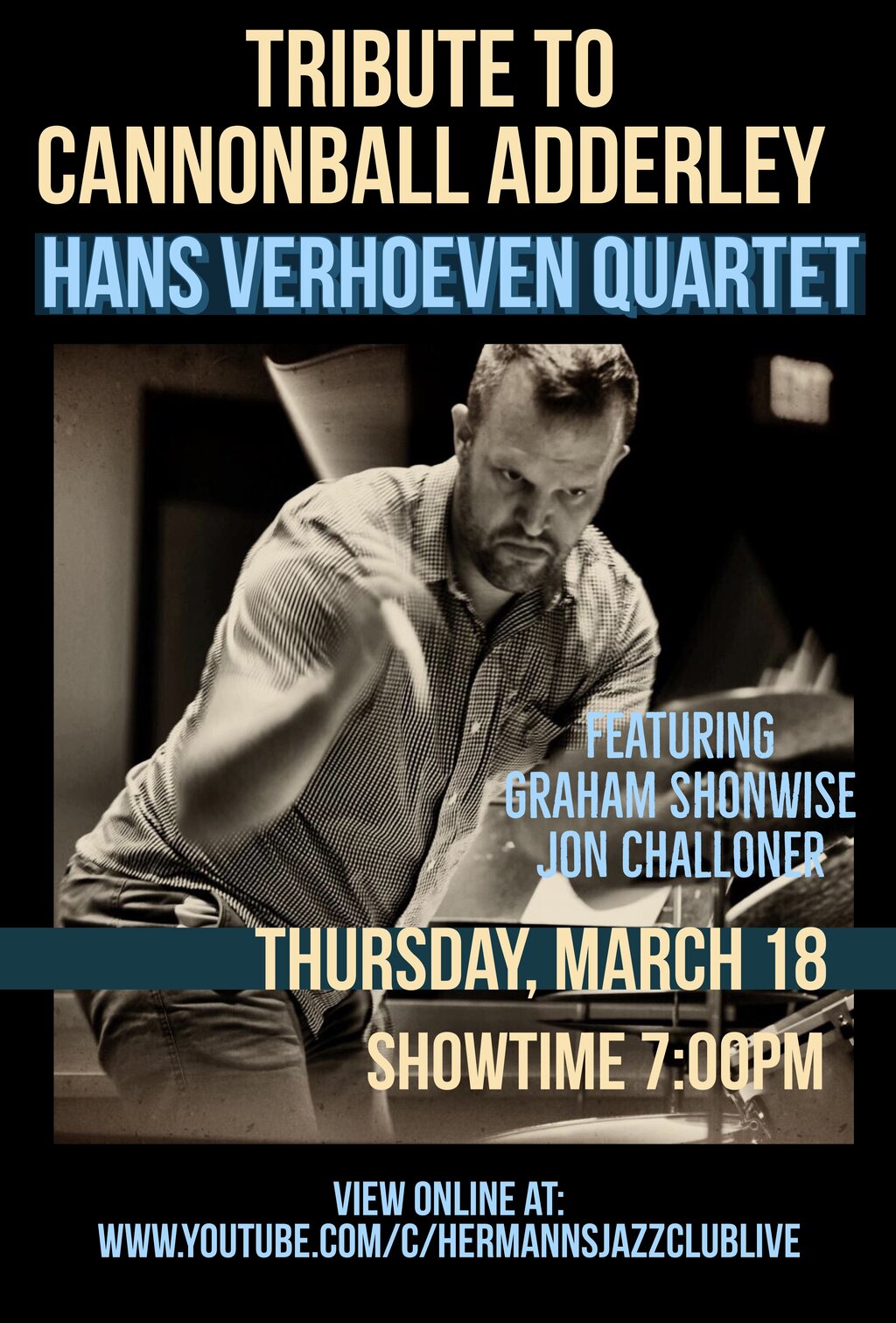 Thu. March 18th 2021 7:00 pm - 8:30 pm (All Ages) Hans Verhoeven and Graham Shonwise pay tribute to the music of the one and only Cannonball Adderley. Grooving, swinging, joyful, and soulful in the extreme, this music has the power to rejuvenate and heal, and to put a smile on your face. Dr. Tony Genge on piano, Graham Shonwise on alto, Jon Challoner on trumpet, Alex Coleman on bass, and Hans Verhoeven on the drums. Our aim with this one is to cook like crazy.