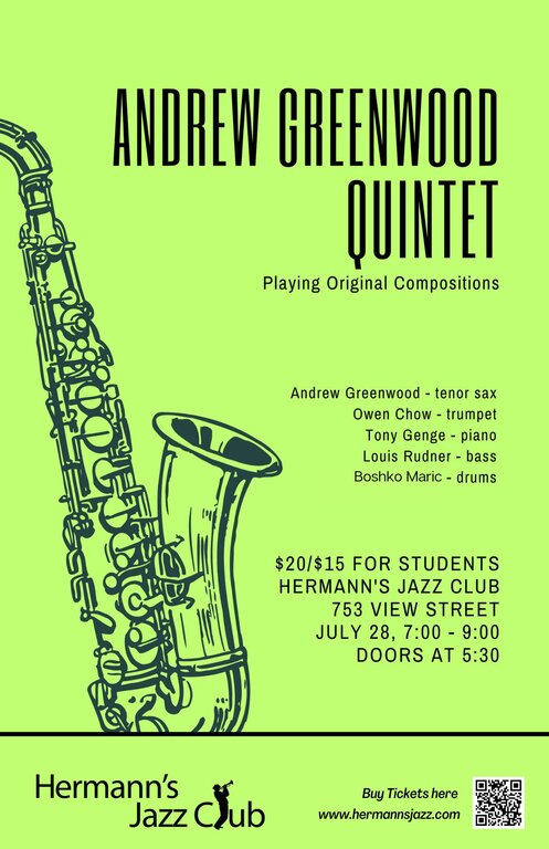 The Andrew Greenwood Quintet is a straight-ahead jazz ensemble that plays original compositions written by each member of the band. Some of its influences are Herbie Hancock, Charlie Parker, and the Jazz Messengers.