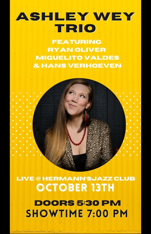 Pianist Ashley Wey teams up with her Trio and features the great Barrie Sorensen and Miguelito Valdes for a night of music at Hermann’s Jazz Club that you won’t forget! One night only!