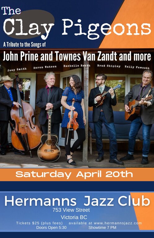 Sat. April 20th 2024 7:00 PM - 9:00 PM doors at 5:30 PM (All Ages) Based out of Victoria, BC, The Clay Pigeons bring a fresh approach to some of the greatest songs written by the greatest American songwriters....John Prine, Iris Dement, Townes Van Zandt, Blaze Foley, Willie Nelson and others. The Clay Pigeons was first conceived by Rachelle Reath, Aaron Watson and Kelly Fawcett, members of the popular Tom Waits tribute, The Beautiful Maladies and features Victoria bass master, Joey Smith and mandolin virtuoso Brad Shipley from Gabriola Island. Expect to hear beautiful songs, big vocal harmonies and stellar instrumental arrangements from 5 of the coasts most celebrated musicians.