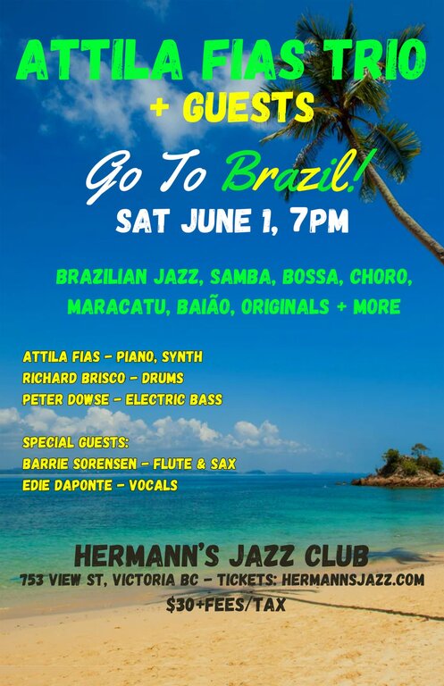 Sat. June 1st 2024 7:00 PM - 9:00 PM doors at 5:30 PM (All Ages) Are you ready? Attila Fias and his band will take you on a fun, exotic, lyrical, sentimental and exhilarating musical trip to Brazil, playing a wide variety of music from that beautiful land and culture! You will of course hear Samba and Bossa Nova, but also the lesser known Maracatu, Baião, Chorinho, modern Brazilian Jazz and other styles by some of Brazil's greatest composers. There will also be a few of Attila's Brazilian-inspired compositions mixed in!