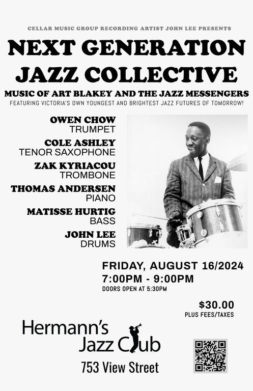 The NEXT GENERATION JAZZ COLLECTIVE consists of some of Victoria's own youngest and brightest jazz musicians led by multi-instrumentalist and Cellar Music Group recording artist John Lee. This concert will feature the music of Art Blakey and The Jazz Messengers from the golden 1961-1964 period when up-and-coming Jazz giants such as Freddie Hubbard, Wayne Shorter and Cedar Walton were making their mark in the Jazz world with their compositions, arrangements and cutting edge improvisations during their tenure with the Messengers.