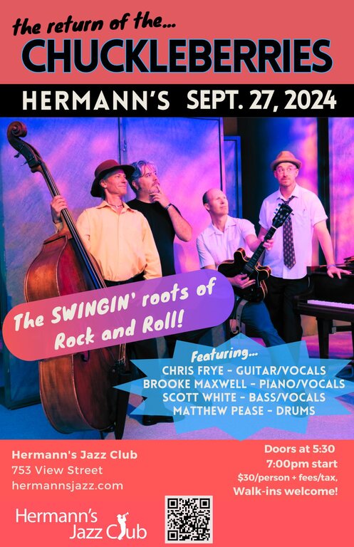 Rock and roll was not born of paint by numbers, three-chord simplicity. No. It was the voodoo alchemy of swing, blues, R&B, gospel, Louisiana roots, sex, rebellion, irrepressible acoustic and barely electrified instruments, and those incredibly captivating, sweet and sweaty voices! And in the case of the mighty Chuck Berry, the purest, most inspired and unparalleled rockin’, rhythmic and meaningful poetry. Let four of Victoria’s most renowned musicians wrap you in their passion for these roots, help put Chuck’s time and music in clear perspective, and get you all reelin’ and a-rockin’!