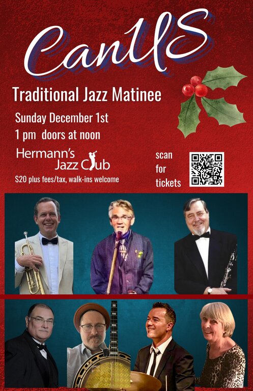 Take advantage of this toe-tapping happy jazz event prior to the upcoming rush of the season! CanUS Jazz Band has local followers but also, due to the Livestream offered by Hermann’s Jazz Club we have listeners not only around North America but overseas due to the 25 years of touring to jazz festivals. Twice CanUS was voted most requested band to return the following year at the prestigious SunValley Jazz Festival!