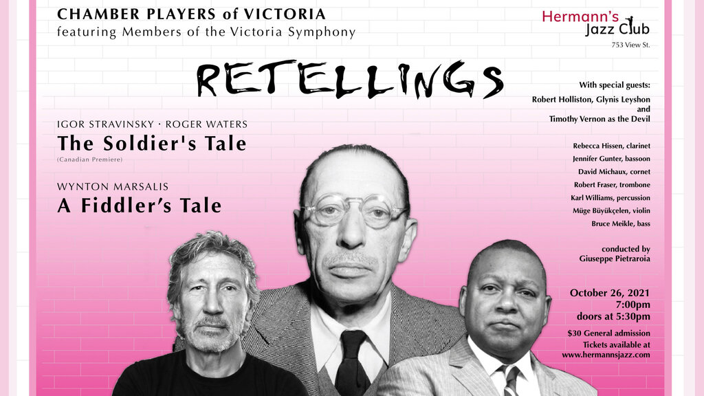 Tue. October 26th 2021 19:00 - 21:00 doors at 17:30 (All Ages) Retellings: Chamber Players of Victoria f. Members of the Victoria Symphony is a very special show at Hermann's Jazz Club for a Tuesday Evening. They will be performing Igor Stravinsky & Roger Waters The Soldier's Tale and Wynton Marsalis "A Fiddler's Tale".