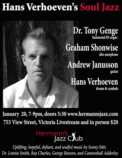 Thu. January 20th 2022 7:00 - 9:00 doors at 5:30 (All Ages) A night of uplifting, hopeful, defiant and soulful music by Sonny Stitt, Dr. Lonnie Smith, Ray Charles, George Benson, and Cannonball Adderly.