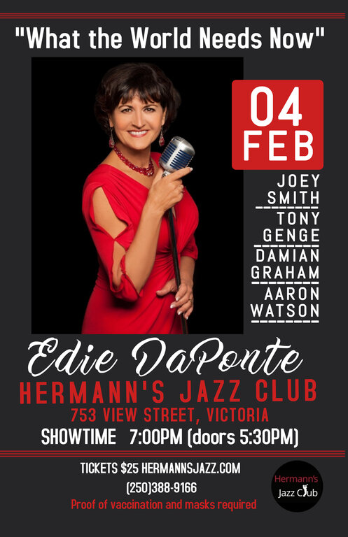 Fri. February 4th 2022 7:00 - 9:00 doors at 5:30 (All Ages) Edie Daponte is bringing her new show “What the World Needs Now" for a debut at Hermann's. The format of the show has the audience transported around the world to celebrate some of the most beloved love songs in English, French, Spanish, Portuguese, Italian, and German. Edie pays homage to classic love songs with her soaring and stirring vocal renditions and is joined by her longtime collaborator Joey Smith on bass, Aaron Watson on guitar/accordion/saw, Damian Graham on drums, and Tony Genge on organ and piano...a veritable who's who of Victoria jazz musicians.