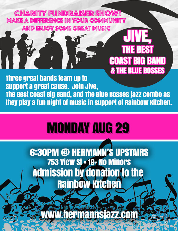 Join the Jive Big Band, the Best Coast Big Band, and the Blue Bosses Jazz Combo in a fun night of music for a great cause. These three bands are joining together to showcase some energetic and entertaining music, while fundraising for a very worthy cause - Rainbow Kitchen. The music isn’t just your typical big band music - you’ll hear some classic swing tunes, but also compositions by Hugh Fraser, Paul McCartney, and even ABBA.