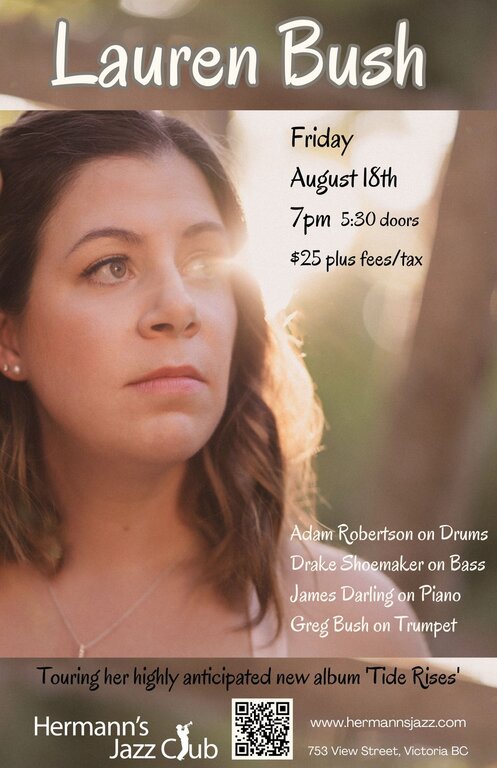 "Tide Rises" showcases her exceptional artistry offering a refreshing blend of favourite standards along with a few brand new originals - Lauren's first foray into songwriting. Backed by a stellar ensemble of accomplished musicians, James Darling on piano, Drake Shoemaker on Bass, Adam Robertson on Drums and her father Greg Bush on Trumpet. This performance promises to be a night of swinging uptempo tunes that will get your toes tapping to soulful ballads to pull at your heartstrings.