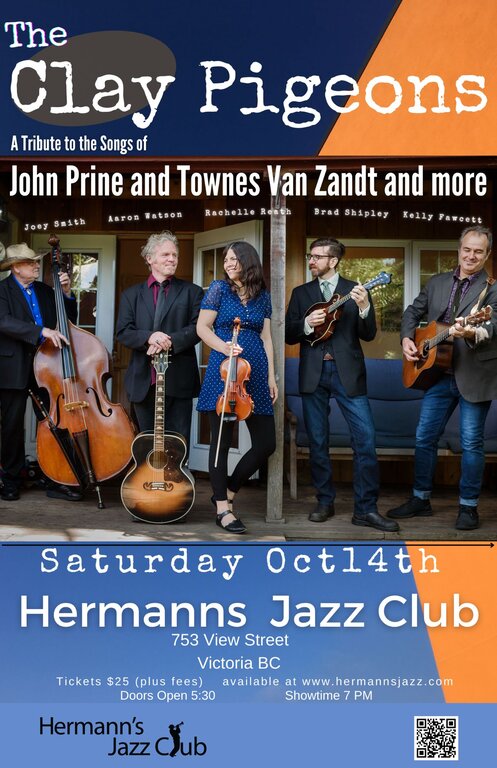 Based out of Victoria, BC, The Clay Pigeons bring a fresh approach to some of the greatest songs written by the greatest American songwriters....John Prine, Iris Dement, Townes Van Zandt, Blaze Foley, Willie Nelson and others. The Clay Pigeons was first conceived by Rachelle Reath, Aaron Watson and Kelly Fawcett, members of the popular Tom Waits tribute, The Beautiful Maladies and features Victoria bass master, Joey Smith and mandolin virtuoso Brad Shipley from Gabriola Island. Expect to hear beautiful songs, big vocal harmonies and stellar instrumental arrangements from 5 of the coasts most celebrated musicians.