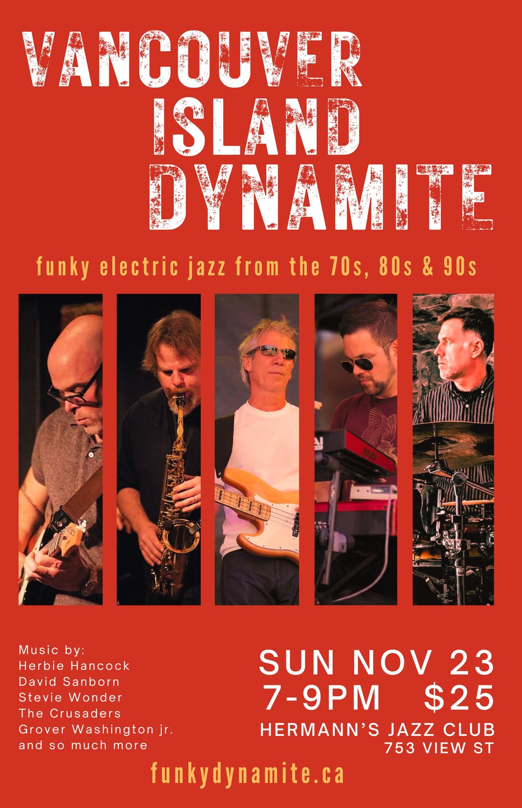 With over a decade of high-octane jazz-funk under its belt, Vancouver Island Dynamite has been around longer than you might know. Catching them live is a bit of a lucky break these days, with the band’s members busy playing in just about every other group in town. But when they do get together, Victoria’s own jazz-funk royalty lights it up. From explosive sets at the Victoria Jazz Festival to sell-outs at Hermann’s, they’ve built a reputation for shows that groove hard and burn hot. You can expect reworked 70s, 80s, and 90s jazz-funk classics and hidden gems, music by Herbie Hancock, David Sanborn, Grover Washington Jr., The Crusaders, and plenty more. It’s been a while, but they’re back, dangerously combustible, funkin’ jazz.