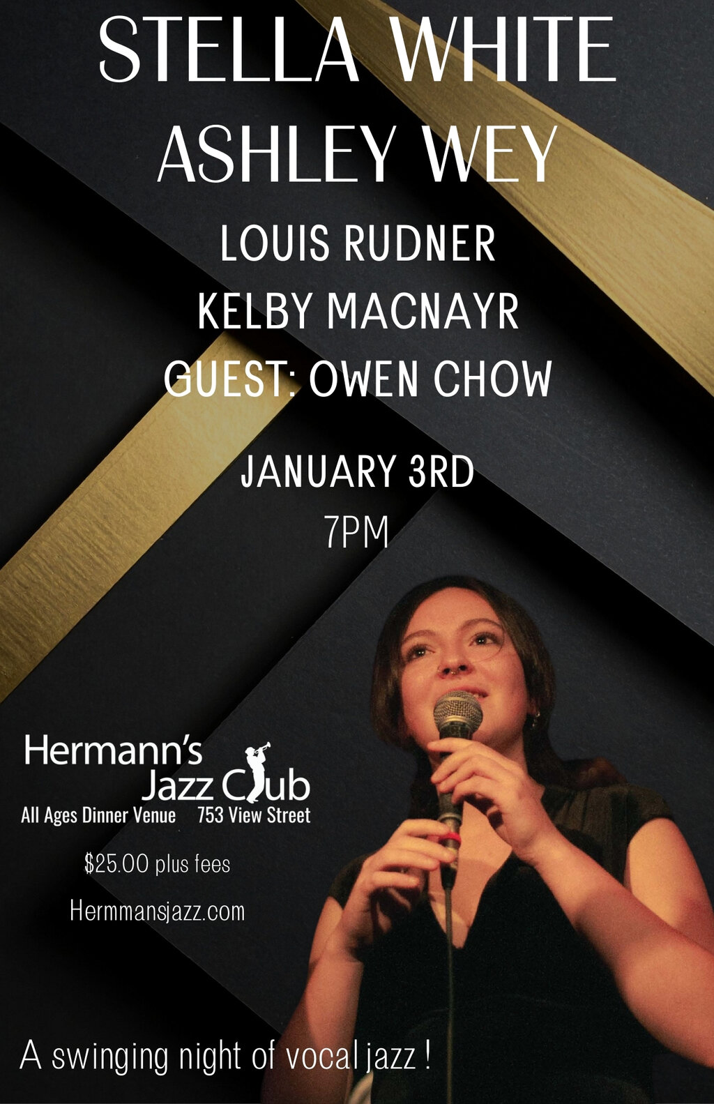 Stella White is an 18 year old Downbeat Award Winning vocalist currently pursuing her Bachelors of Jazz Performance at McGill University. She’s returning to Vancouver Island for the holidays and is so excited to return to this amazing collaboration with Ashley Wey and other fantastic Victoria musicians. Her tone, storytelling, and love for the music is palpable, and she’ll be bringing all of that and more to the stage on January 3rd.