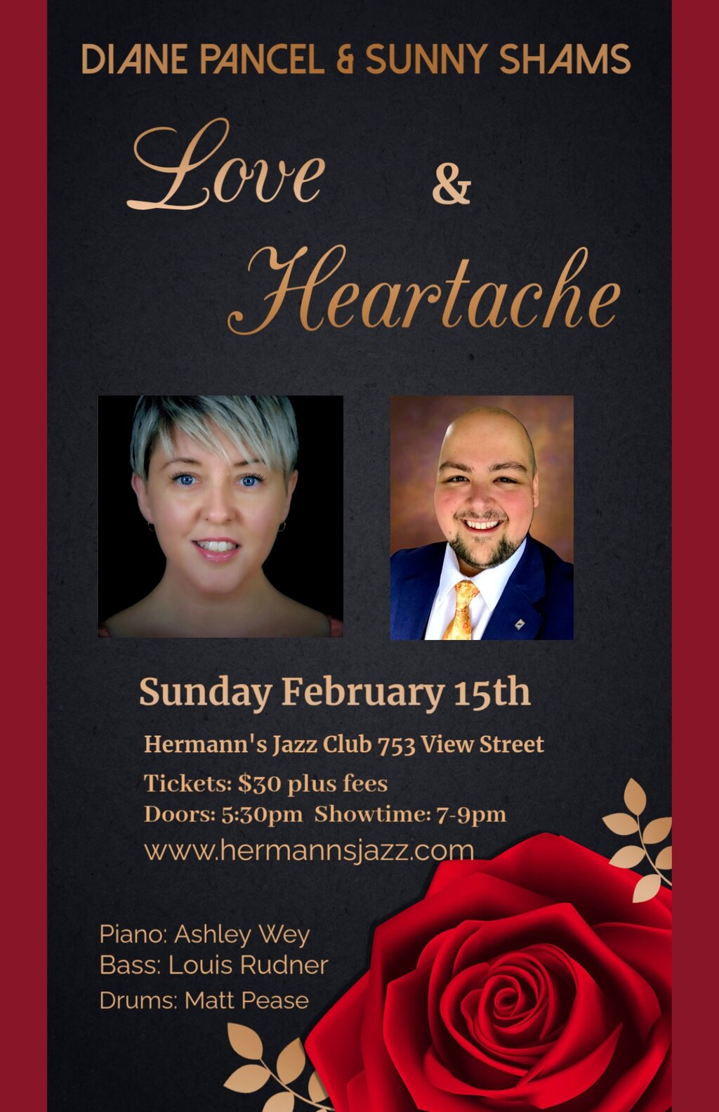 Victoria vocalists Diane Pancel and Sunny Shams bring you a show about the many facets of love featuring Ashley Wey on piano, Louis Rudner on bass, and Matt Pease on drums.
