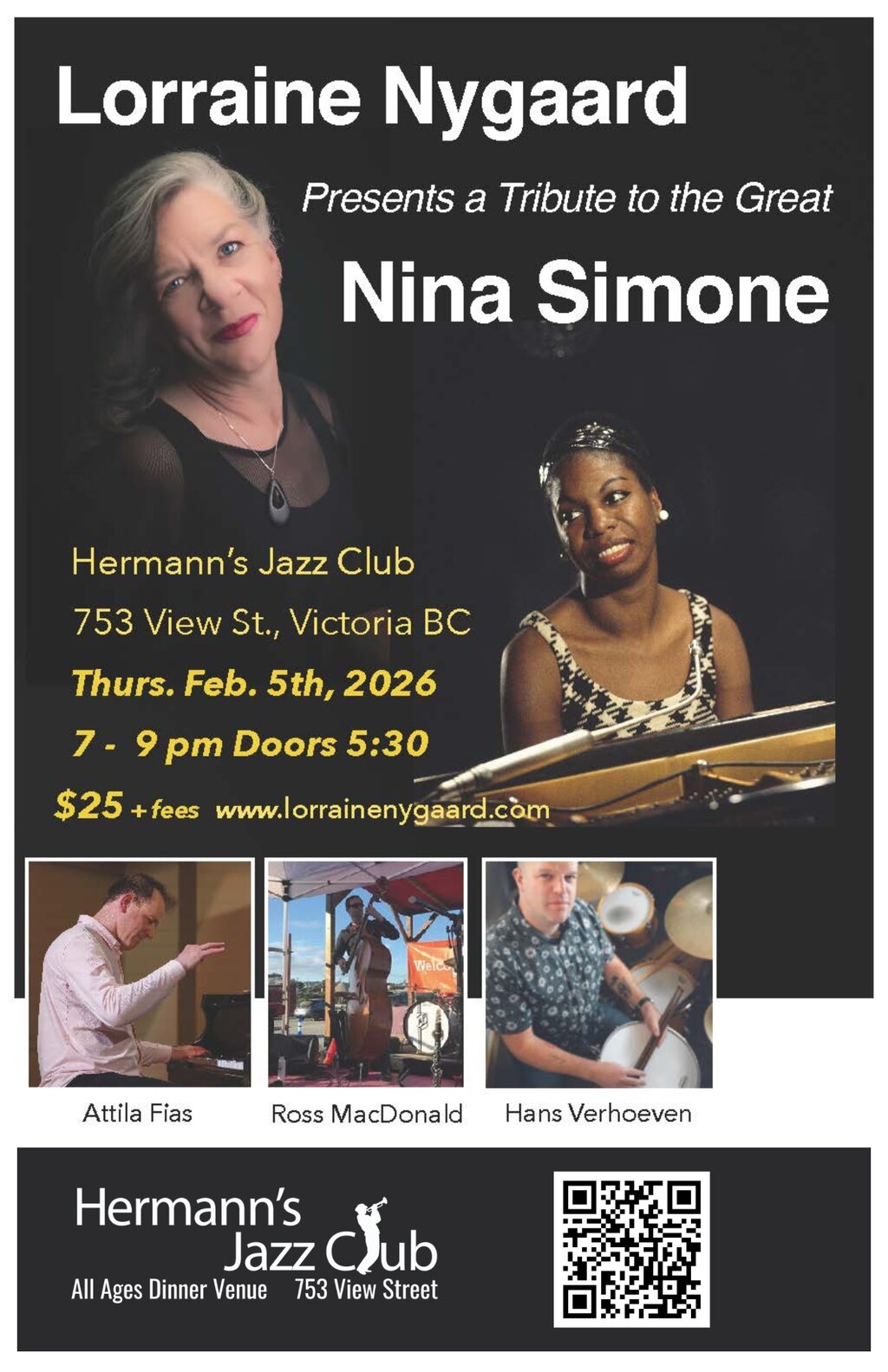 Joining Nygaard are pianist Attila Fias, Ross MacDonald on bass, and Hans Verhoeven on drums.  Lorraine and Attila have collaborated many times before and always have a ball.  Fias has incredible piano chops and a resume that is full of international experience, whether it’s recording, producing, or performing.  You will love his interpretation of Simone’s work.  www.attilafias.com
