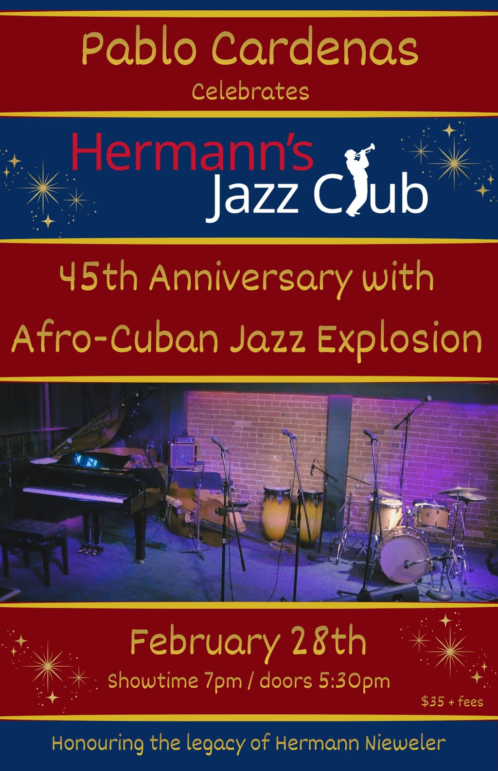 Celebrate Hermann’s Jazz Club's 45th anniversary with Pablo Cardenas and an all-star line-up of musicians and special vocal guests. They will bring an eclectic repertoire with Afro-Cuban Jazz classics, pieces from the all-time Jazz masters repertoire played “Cuban style”, and traditional Cuban pieces to create the type of atmosphere that the occasion deserves.