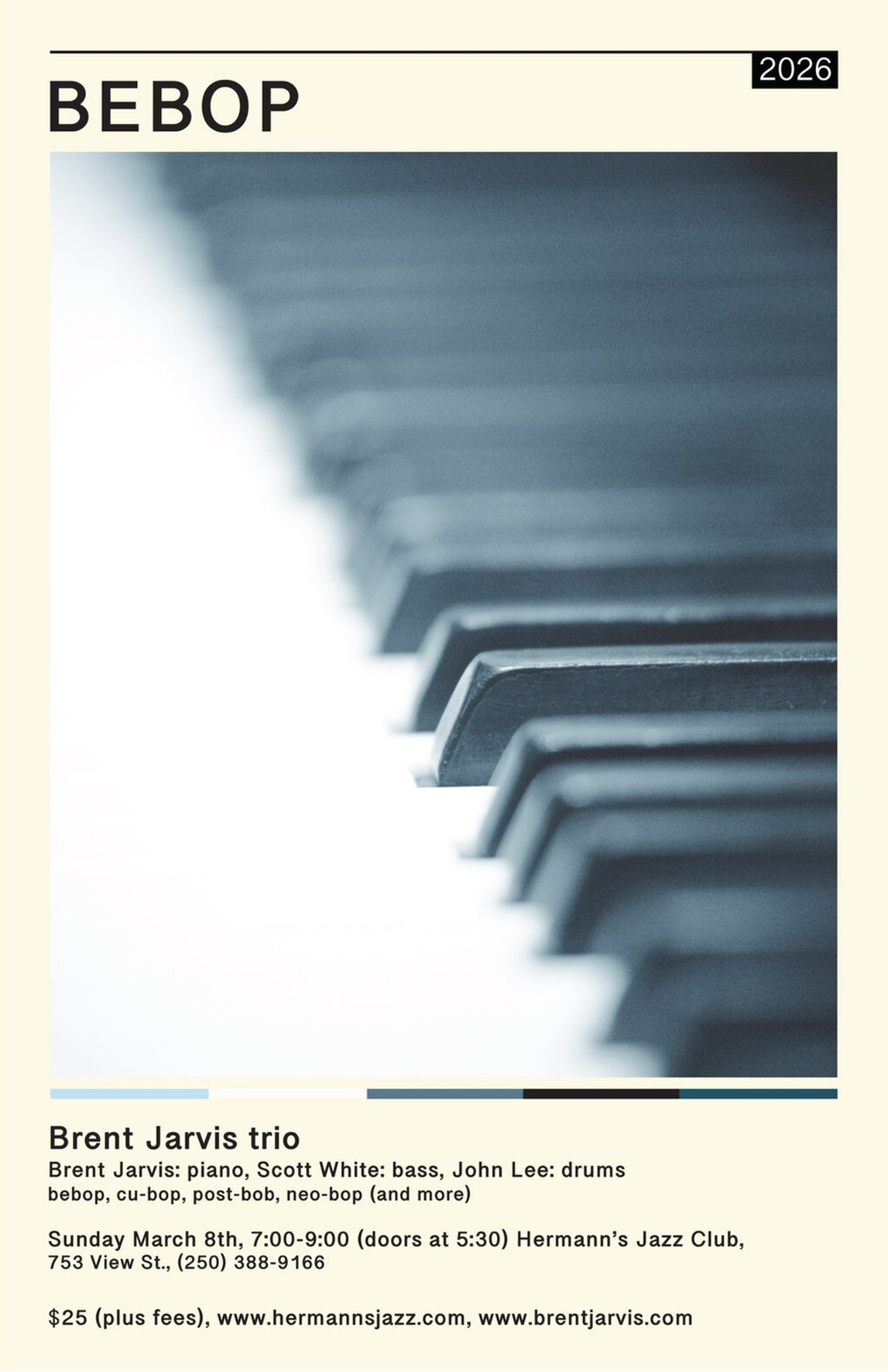 Brent Jarvis follows in a tradition of lyrical, dynamic, and rhythmically complex piano players. Brent’s work has been described as: “captivating... a collaboration between the sensual and the intellectual... music that sparks the senses and transcends genres” (Laura Fernandez - JAZZ.FM91 Toronto), and "romantic but never cloying” (Katie Malloch - CBC Jazz Beat).